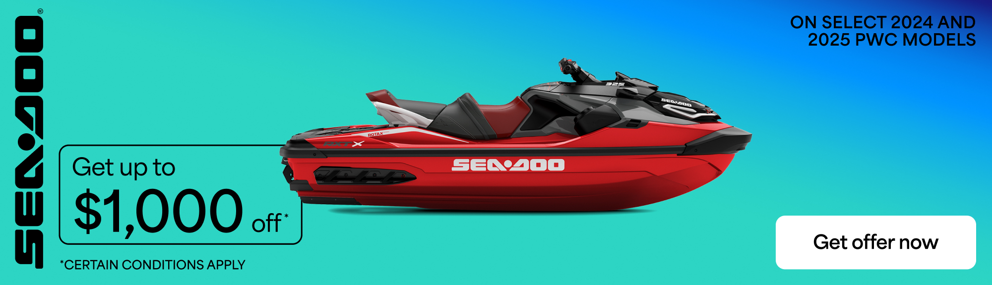 † Get a rebate up to $1,000: Consumers who purchase new and unused 2024 Sea-Doo Rec-Lite (Spark) models are eligible for a $750 rebate. Consumers who purchase any other new and unused 2024 Sea-Doo are eligible for a $1,000 rebate. Consumers who purchase new and unused 2025 Sea-Doo PWC models are eligible for a $500 rebate.