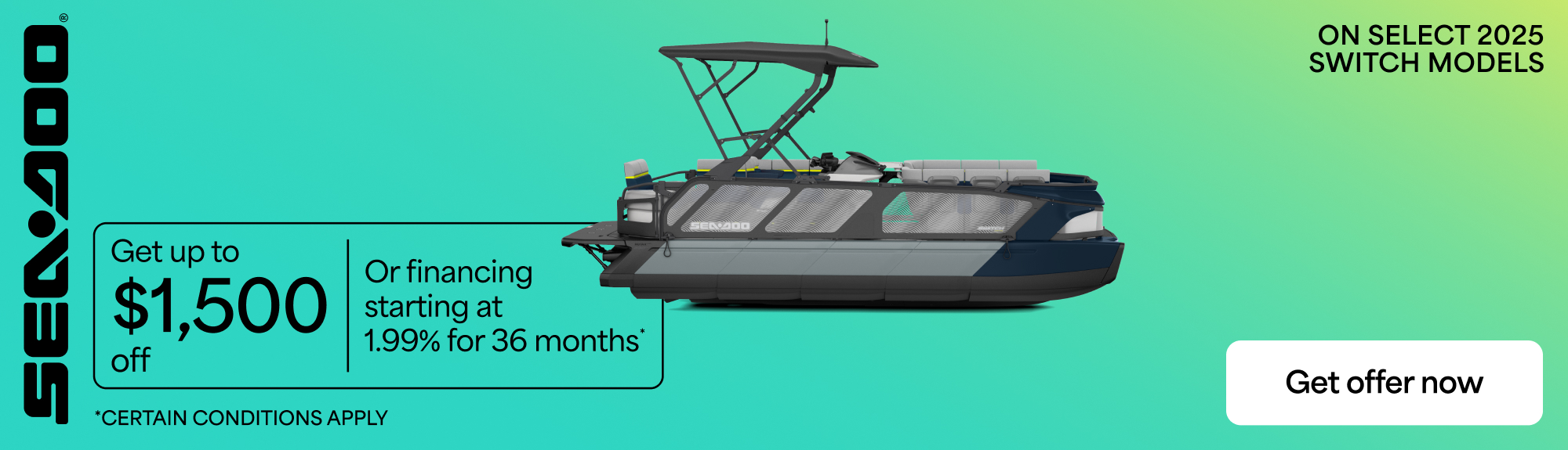 Rebates up to $1,500 or financing starting at 1.99% or 36 months on select 2025 Sea-Doo Switch models